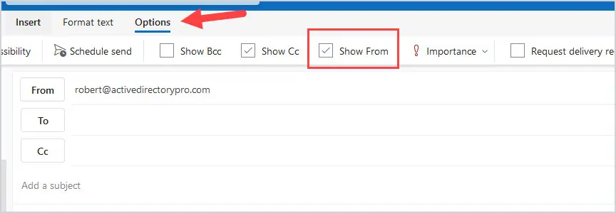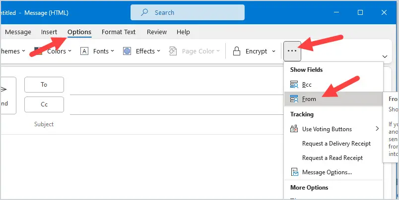 1. To do this, click on New Email. Then click on Options at the top and select Show From.