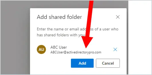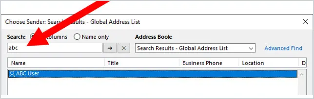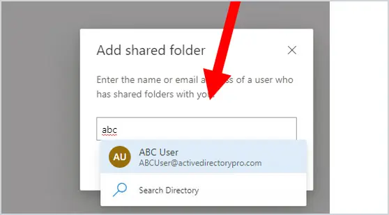 3. Now type in ABC User (the mailbox that 123 User was given Full Access permissions).