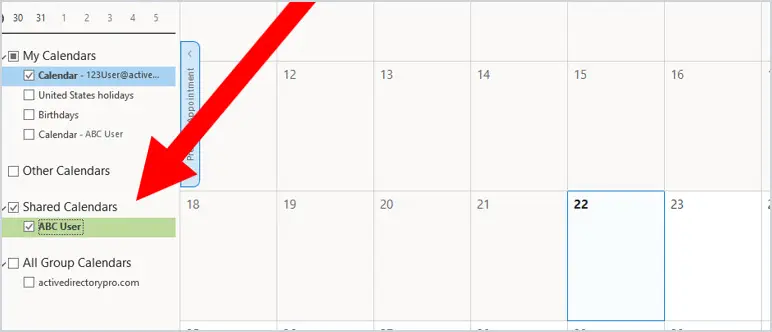 To access the calendar, Click on Calendar and you will see the ABC User listed under Shared Calendars. To view the calendar, select the box to the left of it. If you would like to hide the calendar again, just uncheck the box.